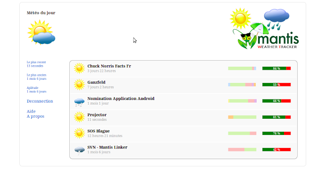Le petit projet MantisBT Weather Tracker est un simple tableau de bord pour MantisBT. Ce script est codé sous forme d'un client qui interroge une instance Mantis en SOAP. Vous pouvez utiliser directement vos logins / mot de passe de votre mantis pour obtenir la vue Météo de votre mantis avec MantisWeatherTracker