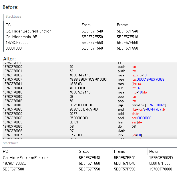 ReturnAddressHider Simple header only library to change return address on current stack frame. Features Supports x86 and x64 code Easy to use Requirements C++14 Windows XP or later 32/64 bit application Only x86-32/x86-64 Example License See LICENSE file for details.