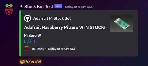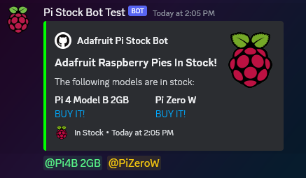 On a set interval, the bot will query Adafruit's product pages for the models you have enabled to watch and will check for the stock statuses changing to in stock. If one or more of the models come in stock, a notification is sent out to the configured Discord server channel with accompanying @role mentions. For Slack, it will just send the notification to the configured channel since Slack doesn't have a roles system like Discord does. In either case, the notification will contain a direct link to the page of the SKU that's in stock so you can buy it right away. Stock statuses are tracked between update intervals, so you won't have to get spammed with the same notification on every check if the bot has already sent a notification for a current stock event of a particular model. This is handled in a smart way to ensure you always get one notification every time any model comes in stock, while never missing a restock!