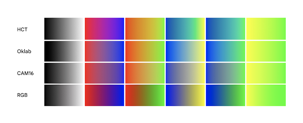 The picture seems very suspect. It's almost like HCT was interpolated in a hue-curve-following fashion, while the Oklab and CAM16 are interpolated in Euclidean space, ignoring the cylindrical transforms everyone knows about. That's apples to oranges, blatant cheating. // The pic does this