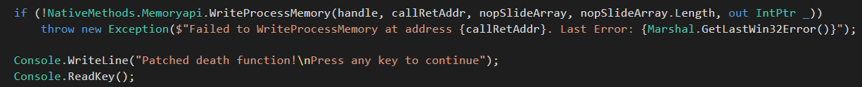 We’re now mom-spaghetti-ready to write the code into the target process. We can call VirtualAllocEx and set the second parameter as IntPtr.Zero, which will allow the function itself to choose a suitable location for us to write our assembly code to, without causing issues. We’ll then use WriteProcessMemory to “install our update”, obviously: