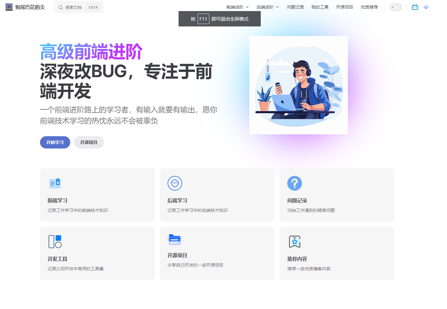 vitepress-blog 狗尾巴花的尖的知识库 是个人开发的博客知识库静态网站 目的在于提升自身技术水平和指导日常工作 作者:狗尾巴花的尖,专注于各种前沿技术的学习和分享 是一个技术进阶路上的学习者,有输入就要有输出,愿你技术学习的热忱永远不会被辜负 网站统计六大方面内容 前端技术 后端技术 开发工具 问题记录 开源项目 优质推荐 博客展示效果