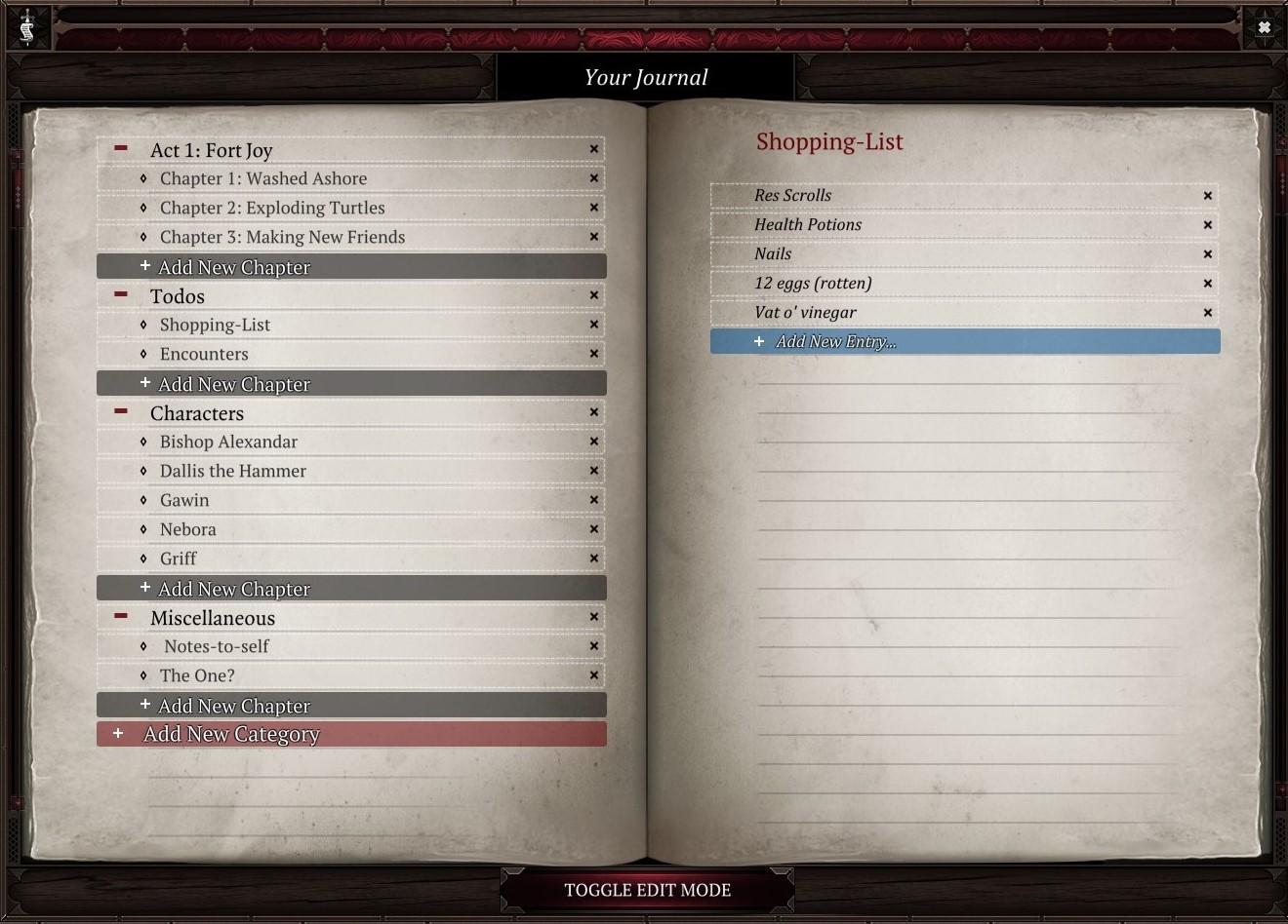 Editable notebooks! Take notes, keep a record of events and characters, and write about your deeds (or misdeeds) as you adventure through Rivellon. Author the most comprehensive compendium of knowledge that transcends even Cranley Huwbert's! or just make a todo-list. Create, View, Edit your entries in-game or externally.