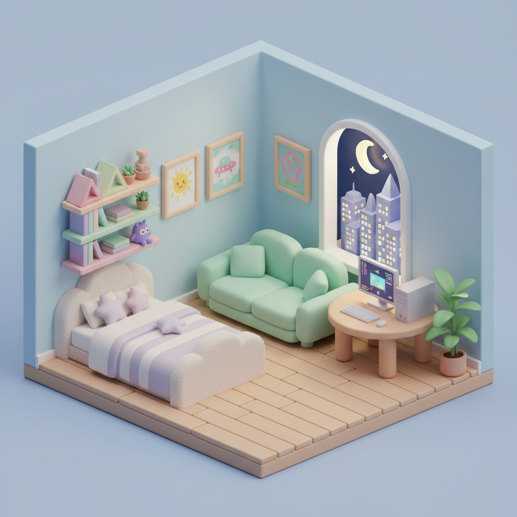 Design a cozy bedroom in a cute 3D style with C4D-quality rendering, presented in an isometric view. The room includes a bed, bookshelf, sofa, green plants, a computer desk, and a computer setup. A framed painting hangs on the wall. Outside the window, a nighttime cityscape is visible with glowing buildings and a dark sky. All furniture and objects should have a soft, rounded, stylized design to match the cute 3D aesthetic. Lighting should be warm and inviting, creating a comfortable nighttime indoor atmosphere.