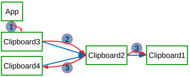 Every time data is copied to a local clipboard that data should be replicated to all other clipboards. For instance, in the previous example data that is copied to the Clipboard3 should be replicated to the other 3 clipboards: