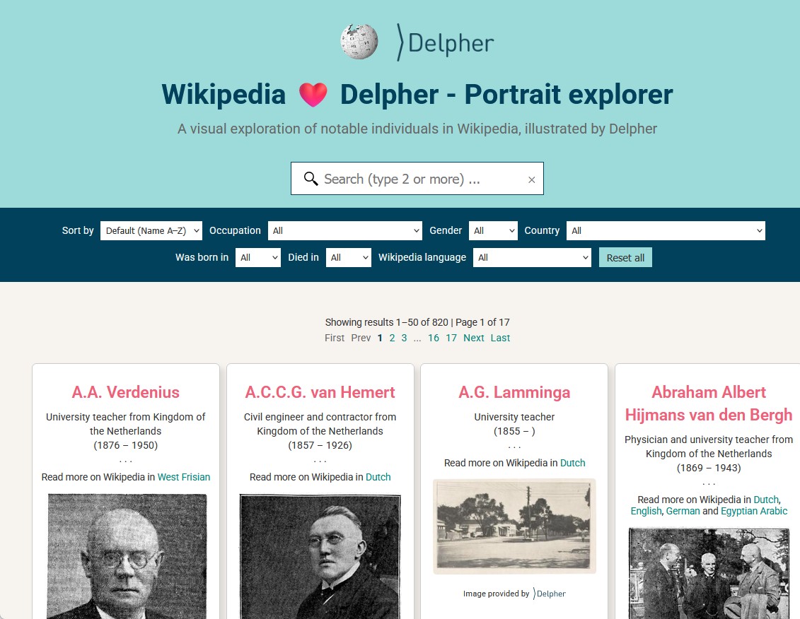 Wikipedia ❤️ Delpher - Portrait explorer, a visual exploration of notable individuals in Wikipedia, illustrated by Delpher.