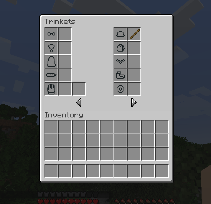 Trinkets adds a slot group and slot system to Minecraft. Slot groups are collections of slots for a certain body part or more vague area. By default there are 6 slot groups (head, chest, legs, feet, offhand, hand) that can have slots added to them, but more groups can be added if desired. Trinkets' UI is intuitive to use, accessible, and attempts to do away with clutter. Its system means that you'll never have a slot that's not used for anything, as mods request the slots they want.