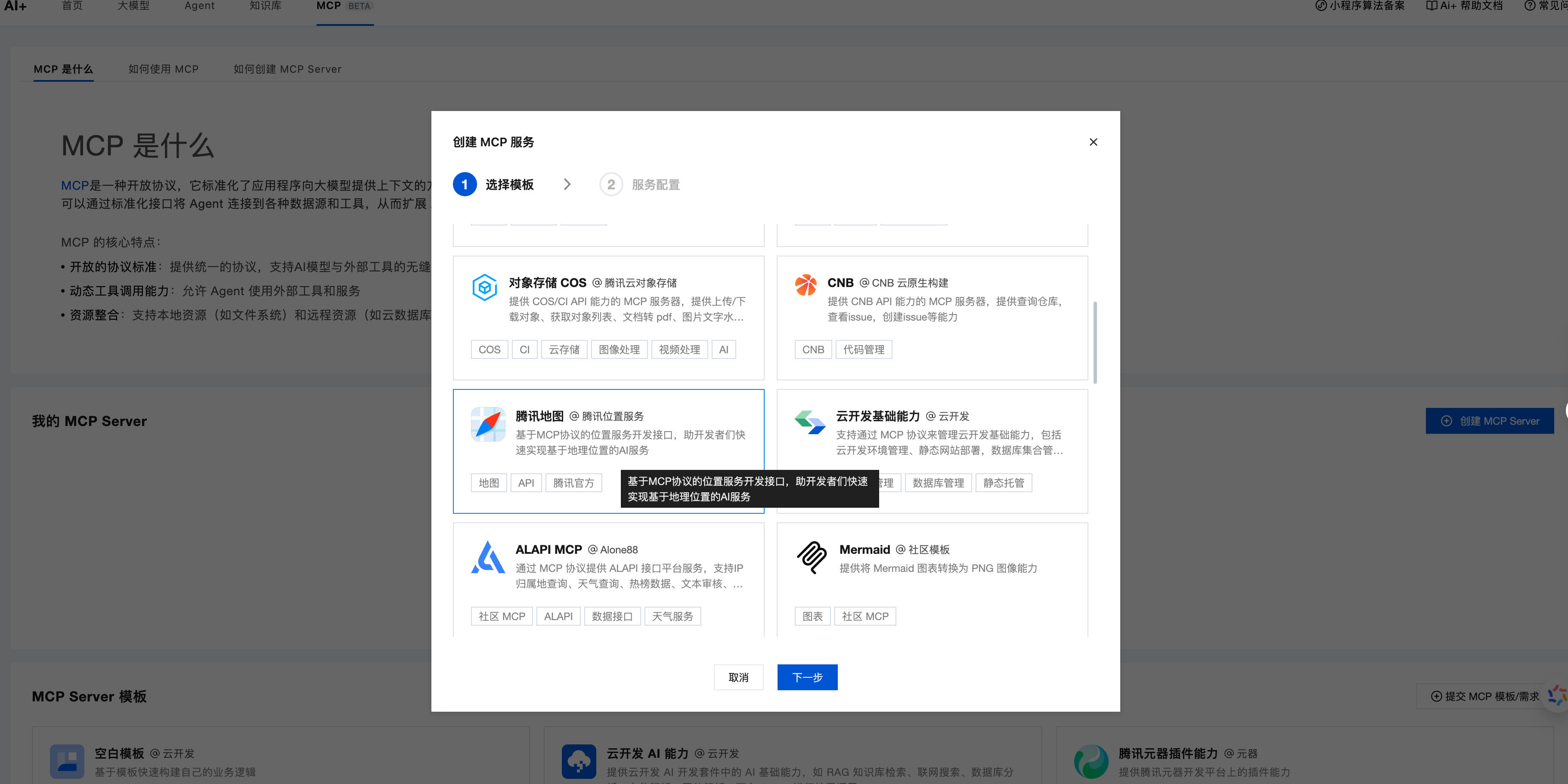 - 以腾讯地图 MCP Server 举例,选择模板进行安装(按照指引获取腾讯地图平台API KEY后,配置环境变量)