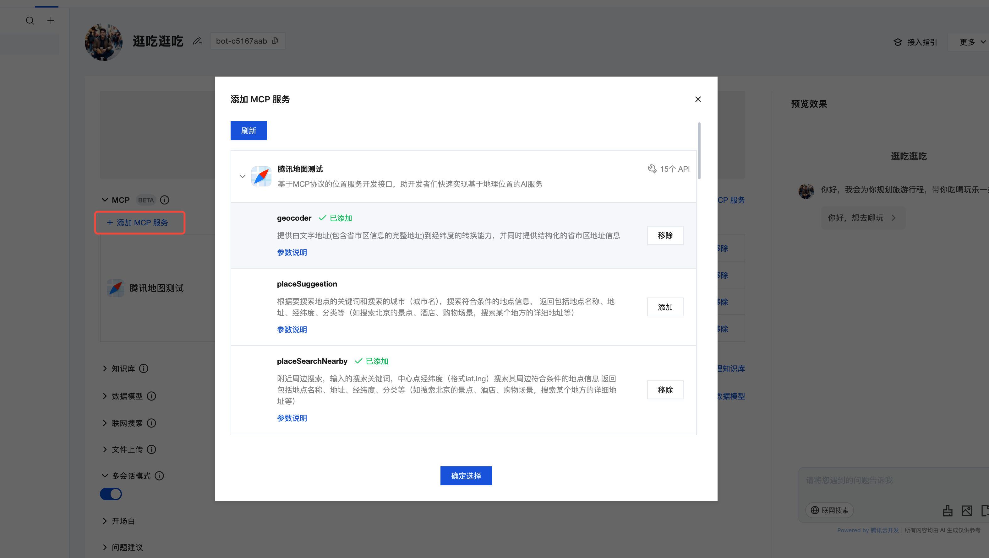 - 在 agent 配置页点击添加MCP 服务,选择对应的MCP Server tools 使用 (此处腾讯地图示例可勾选 geocoder,placeSearchNearby, directionDriving, weather等工具)