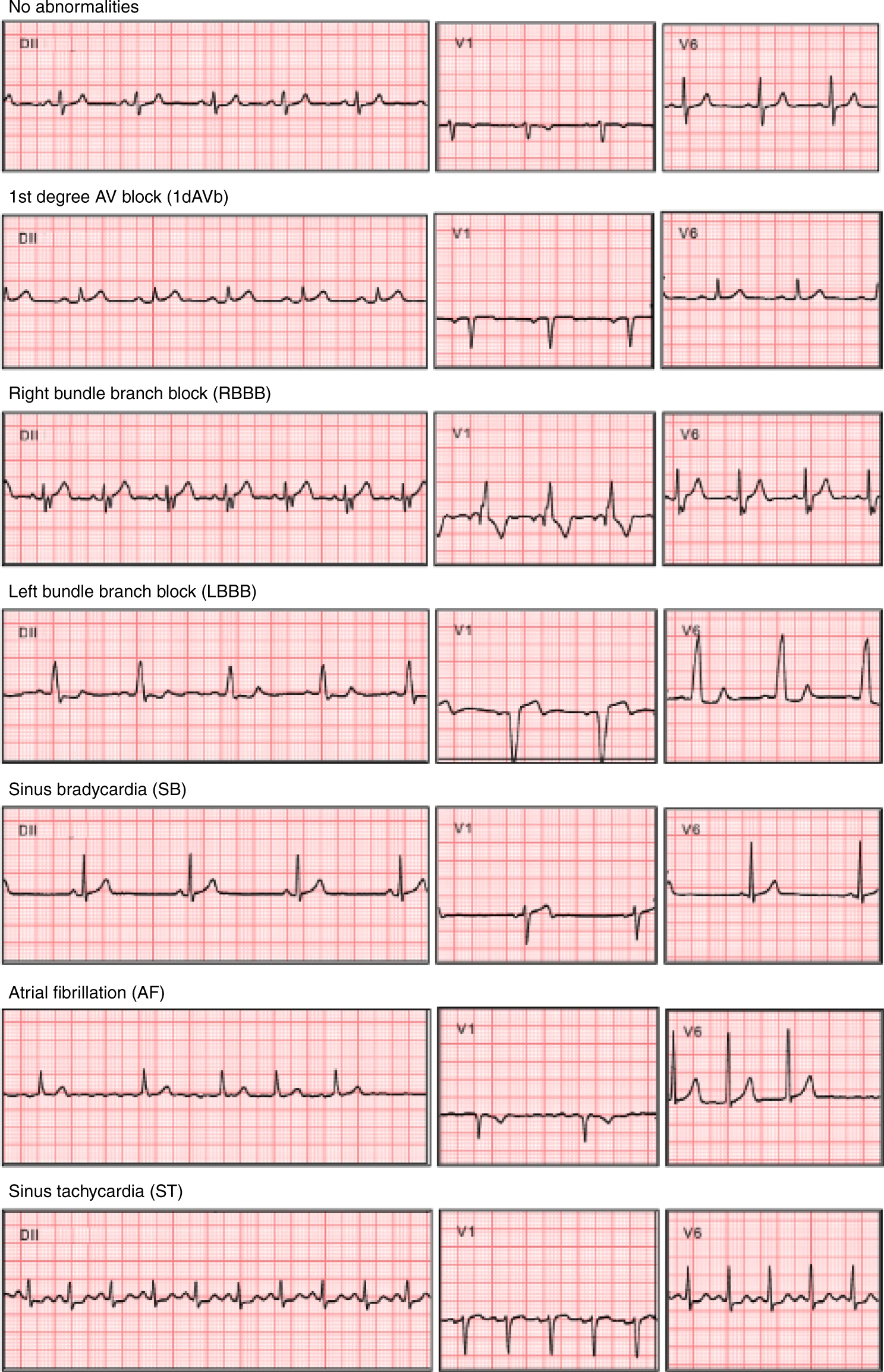 shape = (N, 6). Each entry contains a probability between 0 and 1, and can be understood as the probability of a given abnormality to be present. The abnormalities it predicts are (in that order): 1st degree AV block(1dAVb), right bundle branch block (RBBB), left bundle branch block (LBBB), sinus bradycardia (SB), atrial fibrillation (AF), sinus tachycardia (ST). The abnormalities are not mutually exclusive, so the probabilities do not necessarily sum to one.