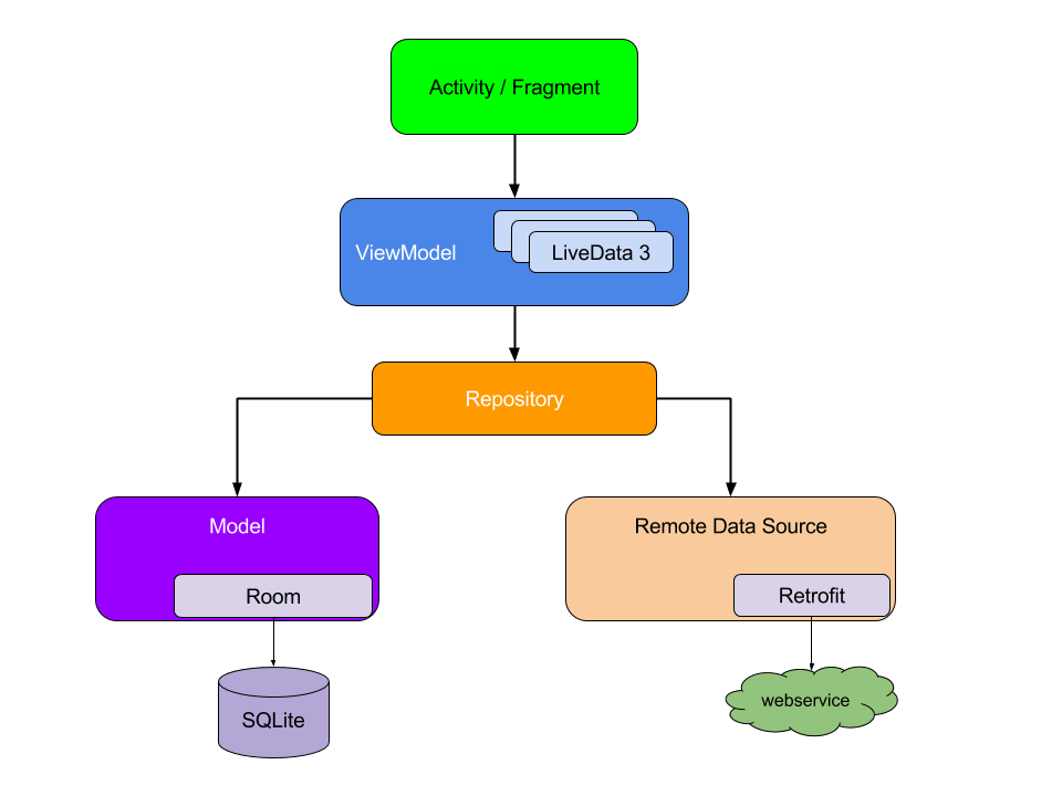 MVVM with Architectural Components: Room, LiveData, ViewModel, Retrofit, DataBinding.