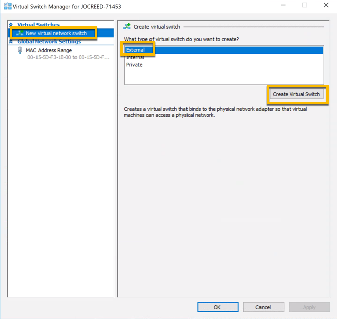 Step 3: Next we will create a virtual switch for minikube. Select New virtual network switch on the right hand side, select External for the network type, and then press the Create Virtual Switch button.