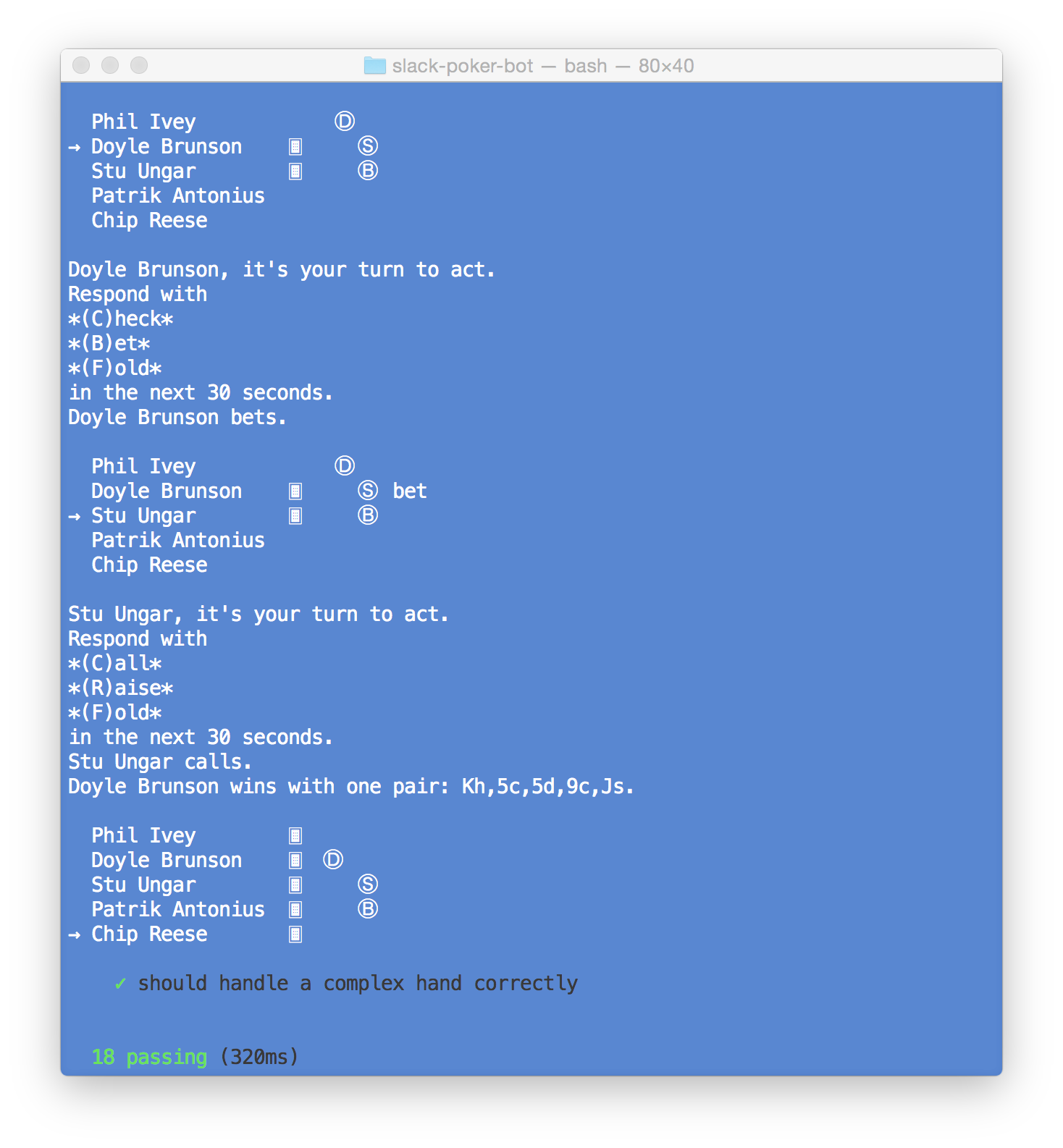 A bot that turns Slack into a legitimate Texas Hold'em client. Start a game in any channel or private group with 2-10 players. PokerBot will deal hands, direct message players with their hole cards, query players for their action, determine the winning hand, and handle the pot.