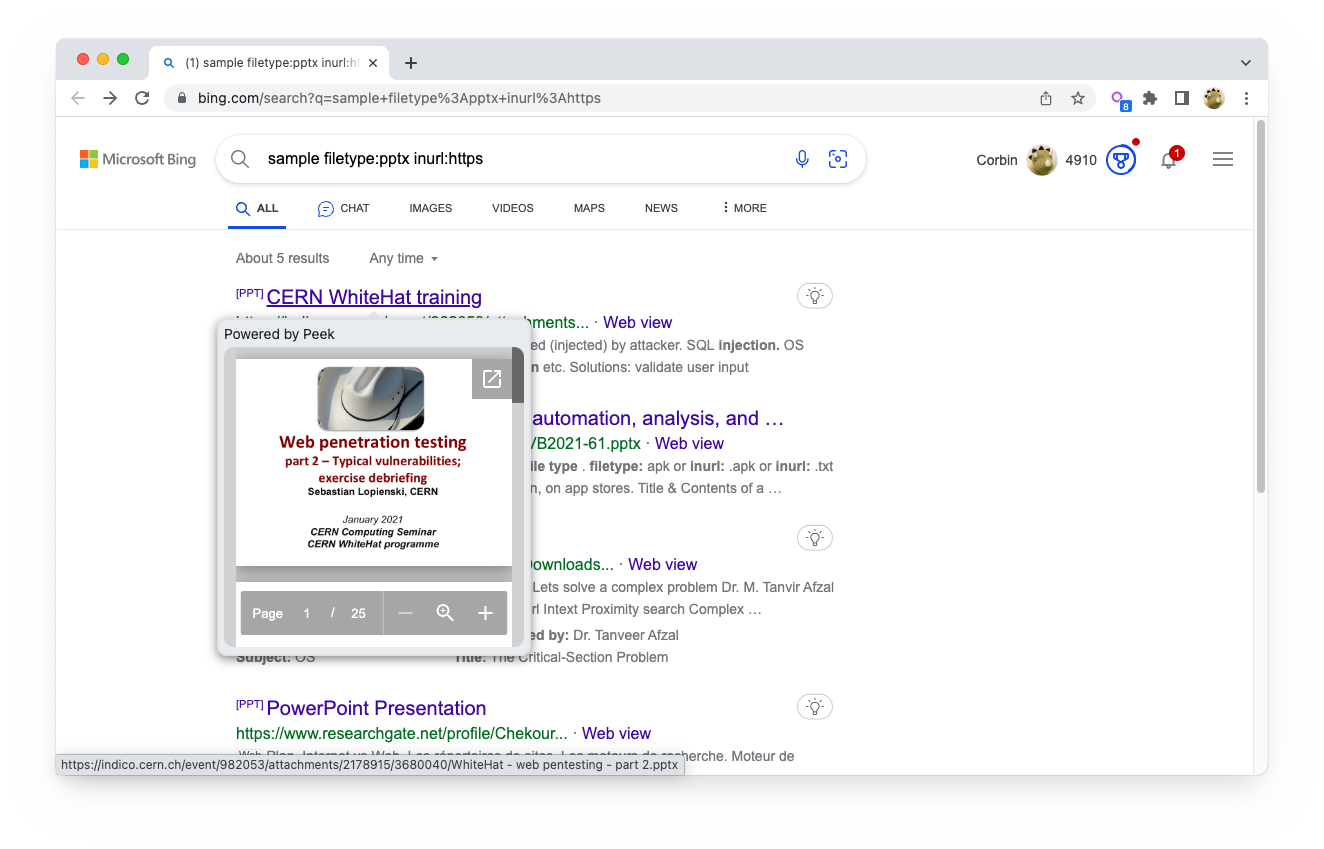 Peek can show previews for PDFs, Microsoft Office documents, YouTube video links, audio files, Google Docs, and much more. It uses the browser's built-in rendering features, in combination with the Google Docs Viewer, Microsoft Office Web Viewer, and other third-party embedded viewers to display rich previews.
