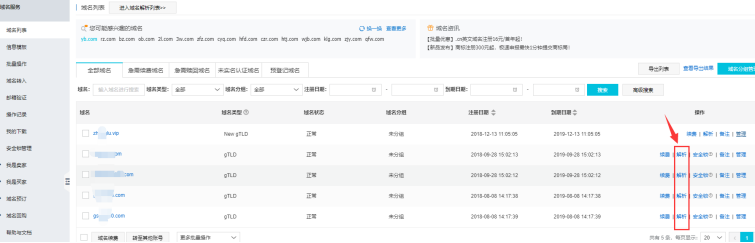 2.解析域名。选择你需要配置的域名,点击右侧解析
