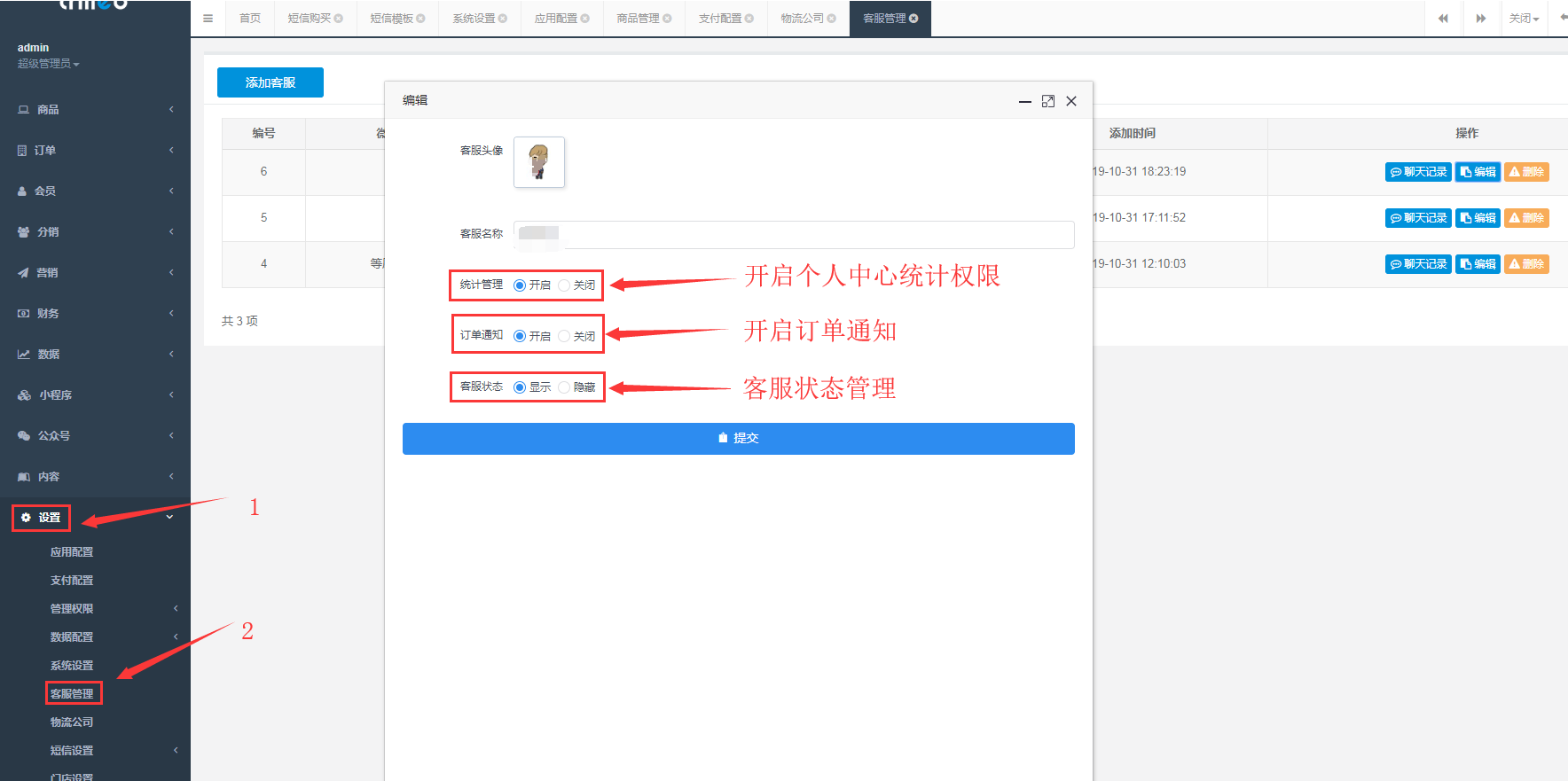 1、客服权限管理 设置>客服设置>编辑:编辑客服权限 统计管理: 客服开启统计管理权限后,可以通过客服的个人中心统计管理查看订单统计,可以通过公众号个人中心进行订单改价、发货处理。 订单通知: 开启订单通知后,客服可以收到公众号订单模版消息通知,配置短息提醒后,会收到订单短信提醒。 客服状态: 开启、关闭客服状态