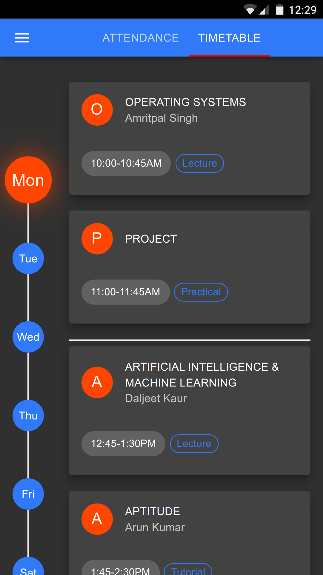 Application has a minimal UI built with ReactJS, MaterialUI. User's data is not kept on any server or DB, its stored locally on user's end. Application features attendance, attendance-marked-history, timetable module.