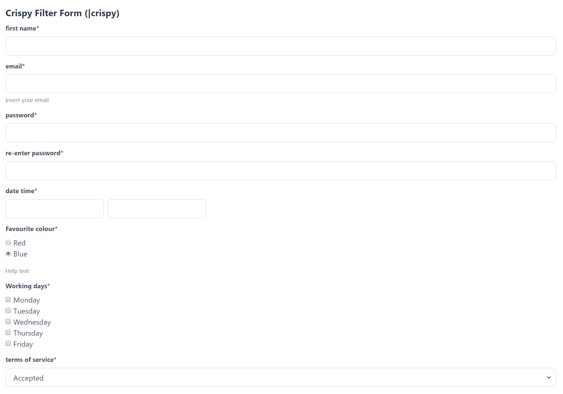 INSTALLED_APPS = ( ... "crispy_forms", "crispy_tailwind", ... ) CRISPY_ALLOWED_TEMPLATE_PACKS = "tailwind" CRISPY_TEMPLATE_PACK = "tailwind"