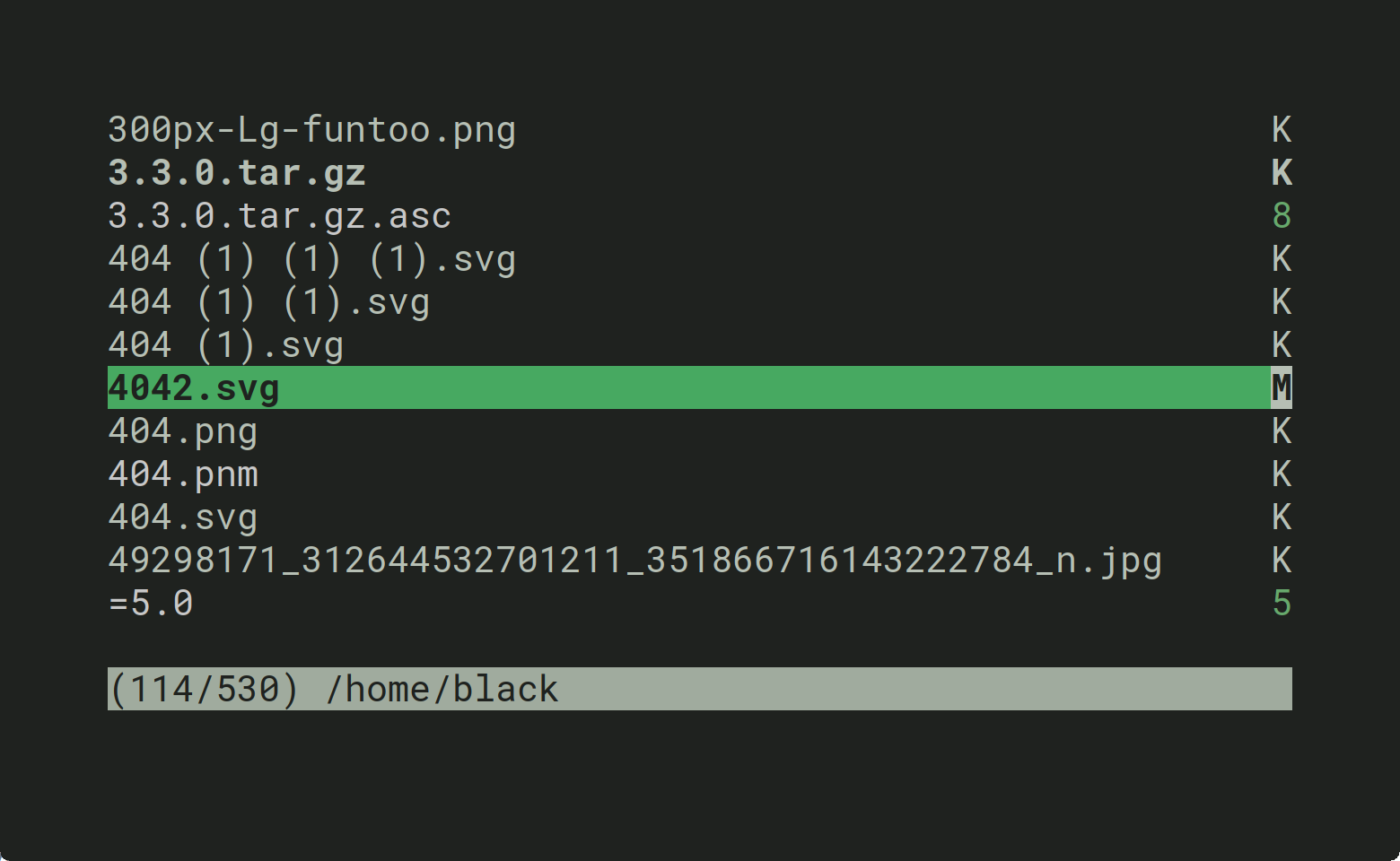 The new "show file size" mode added. This mode shows file sizes (when available) on the right and it switched on by default. Mode may be toggled by "z" key and may be switch off by default by setting "export FFF_SHOW_FSIZE=0" environment variable