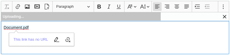When the file upload process is initiated, in the editor content appears a link with href attribute empty and text link corresponds to the uploaded file name.