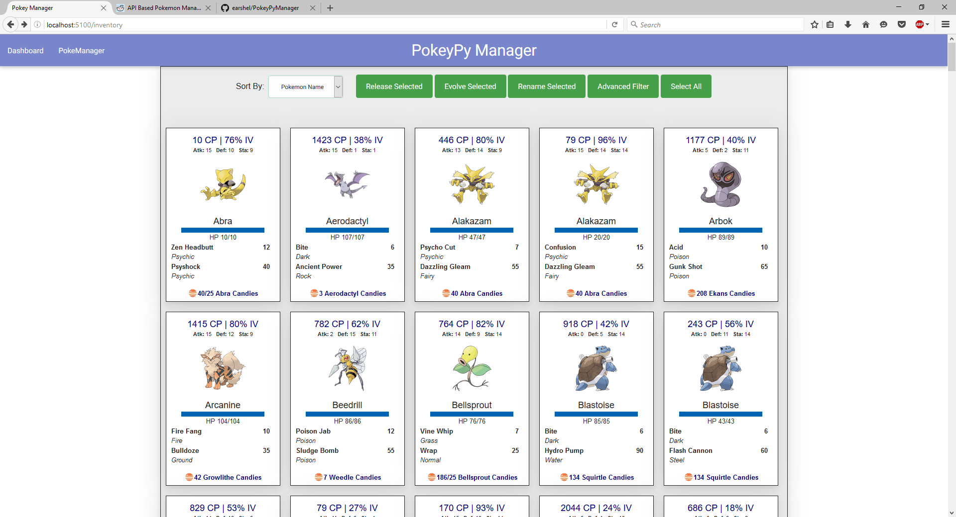 PokeyPy Manager is a tool which allows you to manage your Pokemon in Pokemon Go. It utilizes https://github.com/rubenvereecken/pokemongo-api to gather information and to perform management actions such as releasing/evolving/renaming Pokemon.