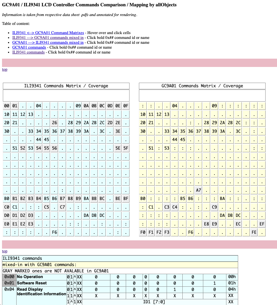 Note *The gray marked matrix cell and list entries in the mixed in list show which command id (0x##) is not available in the other matrix or list. Colons in a matrix cell indicated that the other controller has a command with that code. Attached is the browser loadable GC9A01_ILI9341_cmds_map.html file - just click on it - and two screenshots. The first one shows the matrixes and the second one shows part of the a merged in list. The next post has a brief about the JavaScript in the .html file.Attachments: |