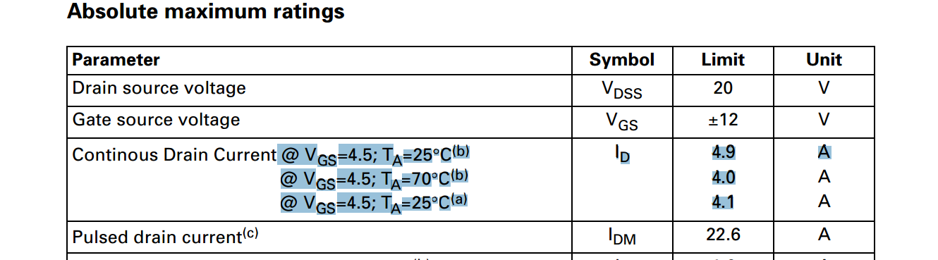 Posted at 2015-04-19 by tage I think DrAzzy is doing a good job of explaining how to read the data sheet. And there is also lots of good detailed information if you google "how to read MOSFET data sheet". if we just look at this particular MOSFET that I mentioned (ZXMN2F30FH), I can show how I go about finding out how much current it can handle: this is the procedure that I normally use for quickly figuring out how much steady state load current I can safely run through a specific MOSFET. |