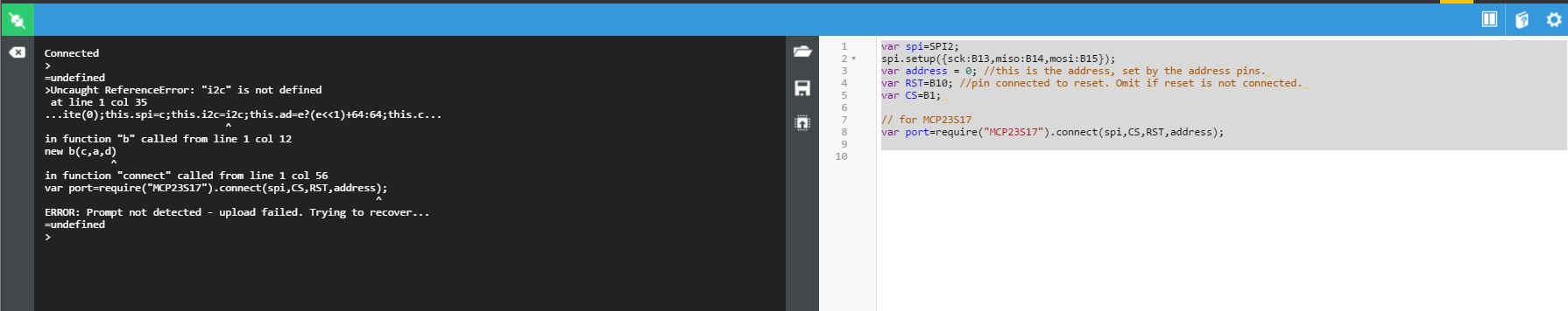 Posted at 2017-01-12 by @gfwilliams Actually I was being unfair. Espruino changed recently so it errors for undefined variables - this would have worked fine previously, but it had some code left over from being copy/pasted from the MCP20S17 that would make it fail now. If you try now I've changed it and it should work (you may have to shut down the IDE and restart it, as it might cache the modules). |