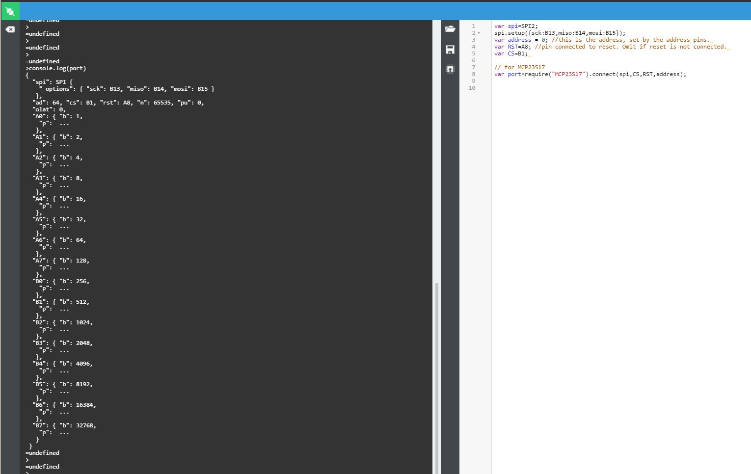 Posted at 2017-01-16 by @gfwilliams Not sure I understand? what's MCP-19/MCP-20? What happens to the value from readPort if you connect up other pins of the MCP23S17 to 0 or 3.3v? |