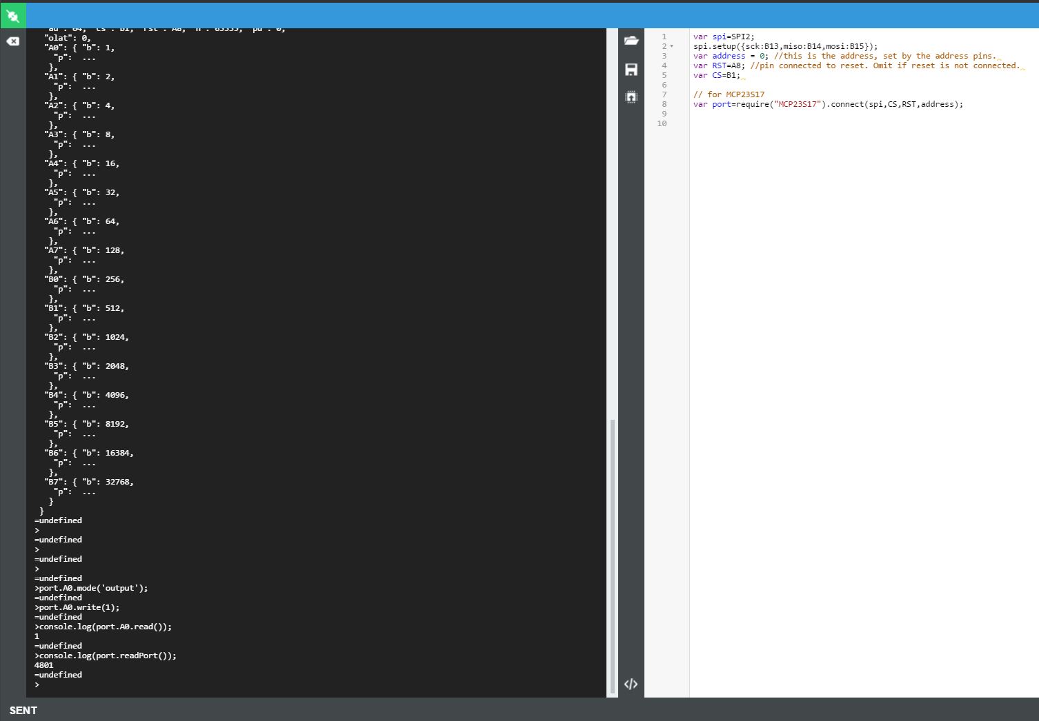 Posted at 2017-01-16 by xas Can you please give me a solution, how can I control the LED in this example (see the attached picture)? PICO can now see the MCP23S17 (see console.log() on the IDE picture), but I cannot control the LED (on/off) with port.A0.* or other commands - what I'm doing wrong?