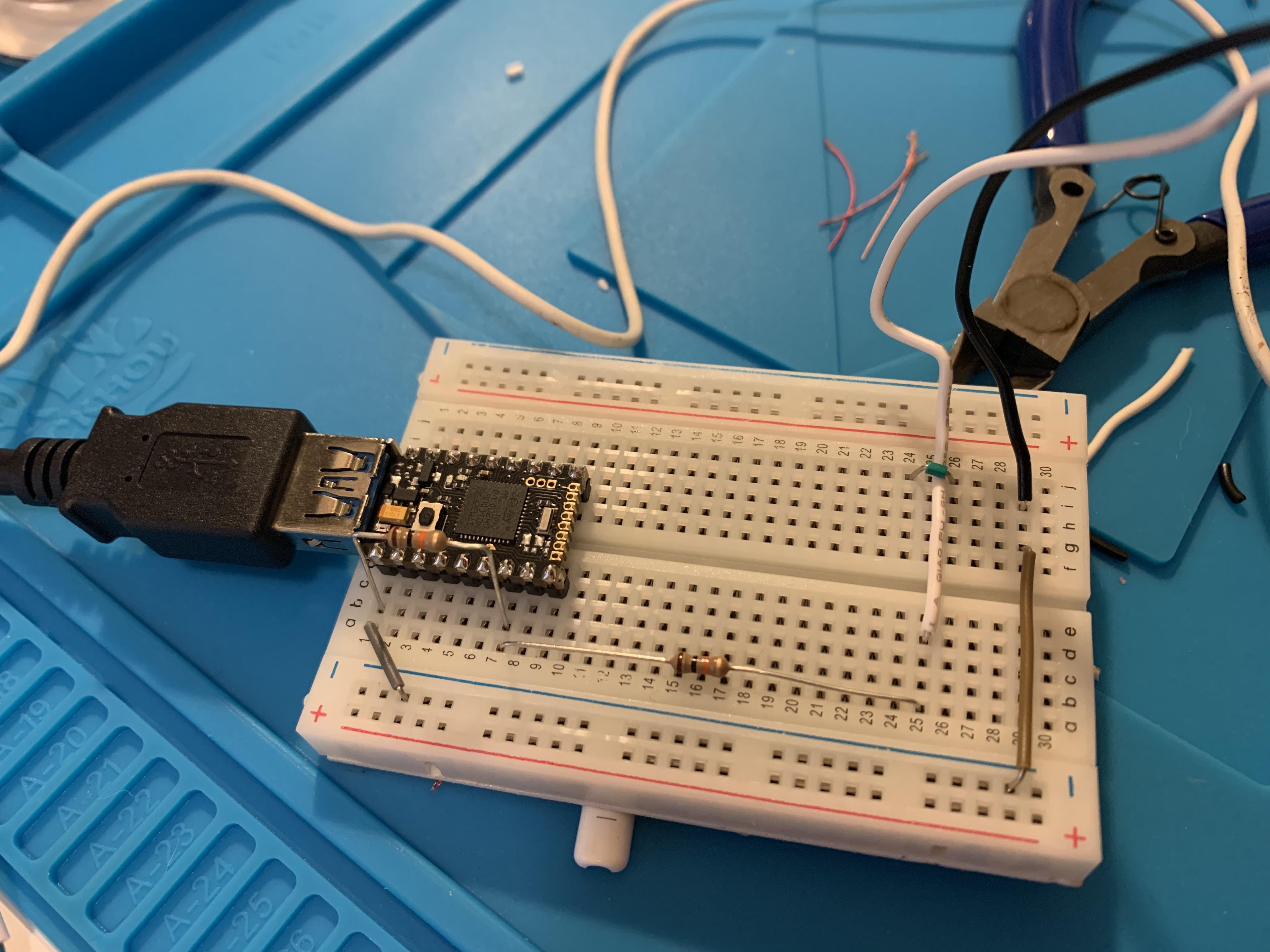 I've uploaded a picture of my circuit, where the white lead goes to the mic line on the iphone headphones (or the sleeve terminal on the adafruit connector) and the black ground goes to the mic ground on the headphones (and the second ring on the adafruit connector). Both resistors are 10k ohms, white leads to B6 and black to GND.