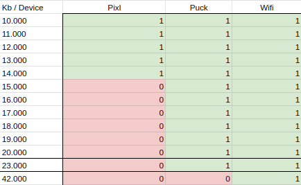 Not entirely sure if this satisfies your 'features' request > 'what you mean by saying "around 40k JS code"' In #4 my request enabled you the discovery of total space available. The suggestion of reading over the 'Internals' documentation will show a JsVar is typically 12 or 16 byte blocks. I mentioned in#4 the ability to u/l a 30K file with mixed code/comments to a Pico. Gordon suggests a possible larger file. It all depends on coding style. At roughly 30 bytes/line of code would generate ~1000 code lines file length. Gordon's estimate seems to be a direct 2500*16 bytes/JsVar == 40000 total bytes of Javascript code. Feel free to use your best estimates. Posted at 2019-07-30 by @gfwilliams There's http://www.espruino.com/Features re 40k: It depends how you upload (to RAM or flash) - see http://www.espruino.com/Saving There is 40k of flash available for code so if you had 40k or under of JS file then you would be able to upload that to flash. Of course it may need more RAM when it ran. Please could you share your original (unbundled) source file? We might be able to suggest some things to let you fit it in since I'm sure your original 'engine' file would be small enough to fit. While Espruino doesn't support Async it does support promises, and I'm pretty sure a decent transpiler would be able to convert your code without much overhead. I'd be amazed if it couldn't be modified very easily to run without the Buffer, tiny-stack and EventEmitter code that you have. Posted at 2019-08-29 by Proceed Hello @gfwilliams, sorry for the late reply. Is there a documentation for how much flash is available for code? I was under the impression that 512kb Flash refers to space available for my program. I have tested some of the devices I have using various file sizes (see attachments). I tested them using the (I generated these file sizes using a long string. I tried a different method as well, but that led to simlar results.) Attachments: Posted at 2019-08-29 by @gfwilliams The Pixl (and pretty much all the nRF52 based Espruino boards afaik) have 40kB of available flash for code. Sadly the rest is taken up with the interpreter and Bluetooth stack. The issue you're having is that by just sending a big string in one go you've got to have a bunch of available RAM - not just for the string which will come in piecemeal, but for the interpreted version of it as well. You could try sending code from the right-hand side of the IDE using the 'direct to flash' upload mode - the IDE will automatically split longer text up into smaller chunks in order to be able to use the 40k. Posted at 2019-08-29 by Proceed I have not used the IDE to test this, but the espruino npm package. As far as I understood the "direct to flash" method uses What would be the difference between a long string and code for the interpreter? Is there a reasonable way to benchmark this? Posted at 2019-08-29 by @fanoush Exact numbers can be read via Storage.getFree and Flash.getFree "Storage" size is configured at firmware build time to 40KB, "Flash" is unallocated free space between end of interpreter code and beginning of Storage that could be added to Storage if configured so. So to guess the maximum possible size add those two sizes (could be e.g. 60-70KB instead of 40) . If it is still not enough then custom build with reduced functionality may give you even more. Minification and maybe also pretokenization ("Pretokenise code before upload (BETA)" choice in web IDE) will help too. |