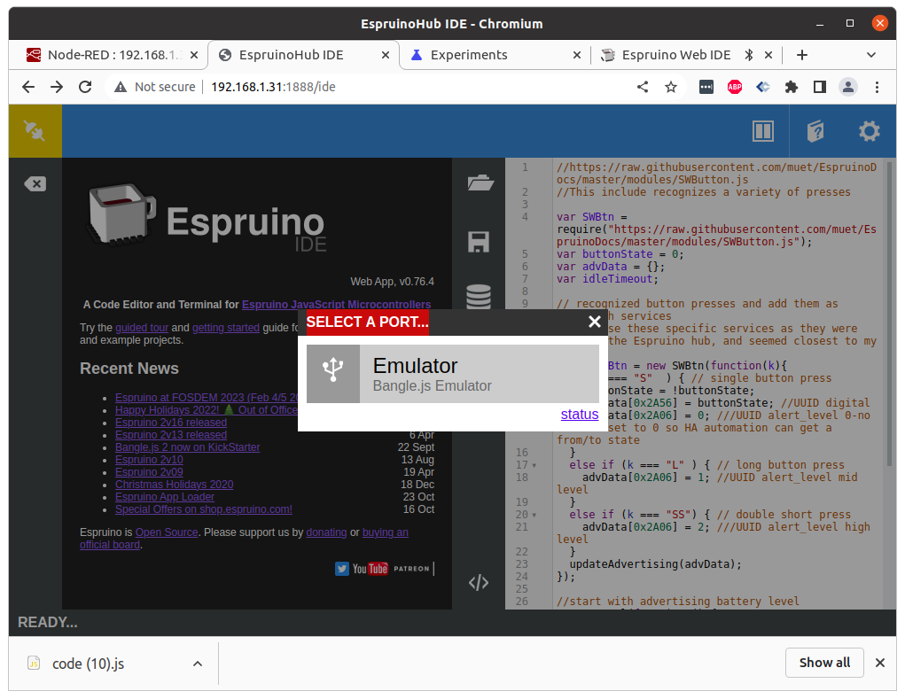 Posted at 2023-02-22 by @gfwilliams Hi - you shouldn't need this if EspruinoHub is working correctly. If you just want to use Web Bluetooth use espruino.com/ide What happens is EspruinoHub serves up a page which creates a WebSocket connection back to EspruinoHub. Then EspruinoHub handles the bluetooth connection (which it doesn't need SSL for) Posted at 2023-02-22 by user153457 Yes but that was my point, you should mention that in the manual that without SSL is not going to allow. Posted at 2023-02-22 by @gfwilliams I'm not sure where in the manual you mean but if you want to do a PR for the extra docs I'll happily merge. I'm still not sure why you'd want to use Web Bluetooth when the whole point of using EspruinoHub is to use the bluetooth that it provides though? Posted at 2023-02-22 by user153457 I think we are missing each other, yes exactly I want to use the EspruinoHub installed on my Raspberry so that I can connect remotely from my laptop (which is far away from the BLE sensors) to the ide and then program the sensors via the WebBluetooth option. I seem to recall that not having SSL enabled on webpages doesn't allow the WebBluetooth dialog to be available? Posted at 2023-02-23 by @gfwilliams Ahh, I think I see what you're getting at. "Web Bluetooth" is the thing that allows the Web Browser to use your PC's Bluetooth connection. And yes, you need HTTPS for that. But that's not what we're using to allow you to access Bluetooth sensors from far away. Instead, EspruinoHub uses a WebSocket connection from the page that hosts the IDE back to EspruinoHub, and the bluetooth connection goes through that. Web Bluetooth is not needed. Maybe you could check If they have, when you open the You could always check the Chrome Debug console to see if anything looks amiss Attachments: Posted at 2023-02-23 by user153457 It seems to have crashed today let me investigate... Posted at 2023-02-23 by user153457 It seems to be happened at midnight.