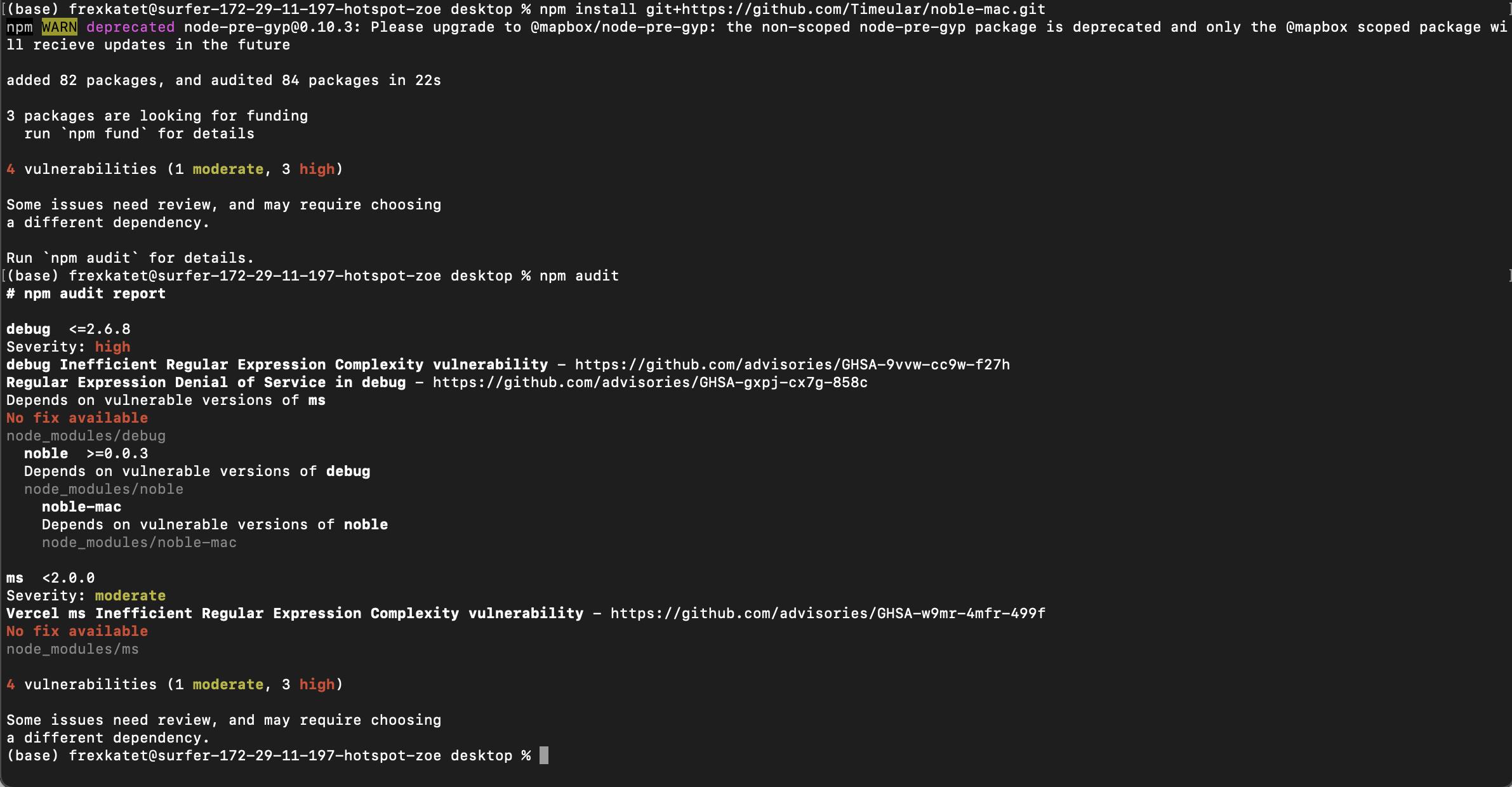 Posted at 2023-06-05 by @gfwilliams Were any error messages shown? I don't have a new enough Mac here, but I'd be pretty sure it is possible to do - maybe you just needed to install the Mac build tools so the native module can be built? Posted at 2023-06-05 by @gfwilliams I just did a quick search and I noticed https://github.com/Timeular/noble-mac - any luck if you try and install that? Posted at 2023-06-05 by user155285 yea I sadly tried this one too .. but I still have the same errors as trying to install any version of noble I found. (screenshot attached) Attachments: Posted at 2023-06-05 by @gfwilliams I don't actually see any errors there? Those red things seem to be errors about security vulnerabilities, but you probably don't need to worry about those |