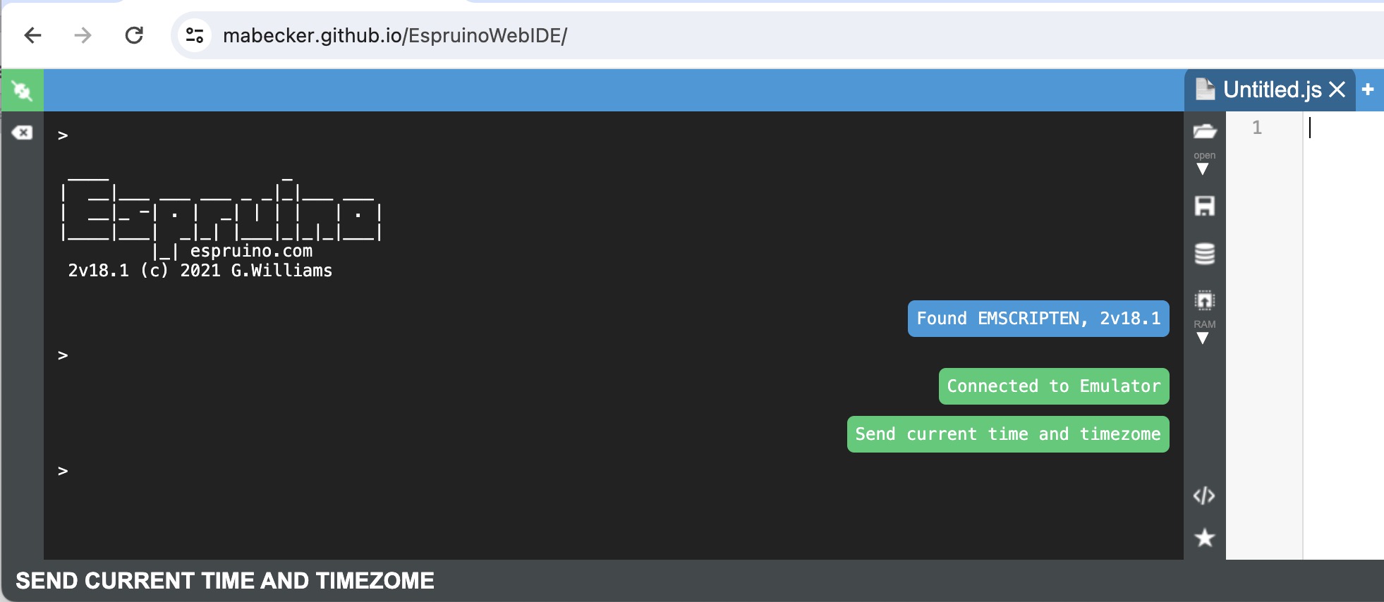 And I think you'll be done. It might be a nice thing to have as an option, so you could copy the code from https://github.com/espruino/EspruinoWebIDE/blob/master/js/plugins/codeLink.js which puts an option in Settings which shows/hides the icon when toggled Posted at 2023-10-30 by @MaBecker Great, just added a sendTime.js, looks like I missed something ....because the clock icon does not show here on http://mabecker.github.io/EspruinoWebIDE/ Posted at 2023-11-02 by @gfwilliams Looking at Posted at 2023-11-02 by @MaBecker Ups, missed that one .... Thanks. Now it works. Let me know if you like to include this into the original WebIDE. Posted at 2023-11-02 by @MaBecker add screen shot Attachments: Posted at 2023-11-03 by @gfwilliams Thanks! Well, someone asked a while ago (I think it was part of 'Projects'?) if there could be a way to upload some predefined commands from a menu, like setting time, If a menu was added so you clicked a button and then clicked again on the command you wanted, do you think that'd be good enough for you? Also, if it was, what other commands would be useful? Posted at 2023-11-03 by @MaBecker Yes this is a feature the WebIDE lost, it was named snippets. |