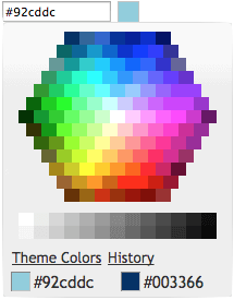 evol-colorpicker is a web color picker which looks like the one in Microsoft Office 2010. It can be used inline or as a popup bound to a text box. It comes with several color palettes, can track selection history and supports "transparent" color. It is a full jQuery UI widget, supporting various configurations and themes.