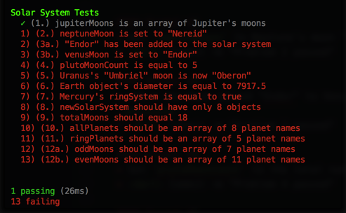 - Add a new moon called "Endor" to Venus's moons array. Save this moon in