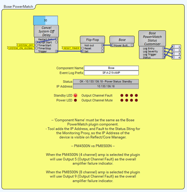 When the PM4500N (4 channel) amp is selected the plugin will use Output 5 (Output Channel Fault) as the overall amplifier failure indicator.