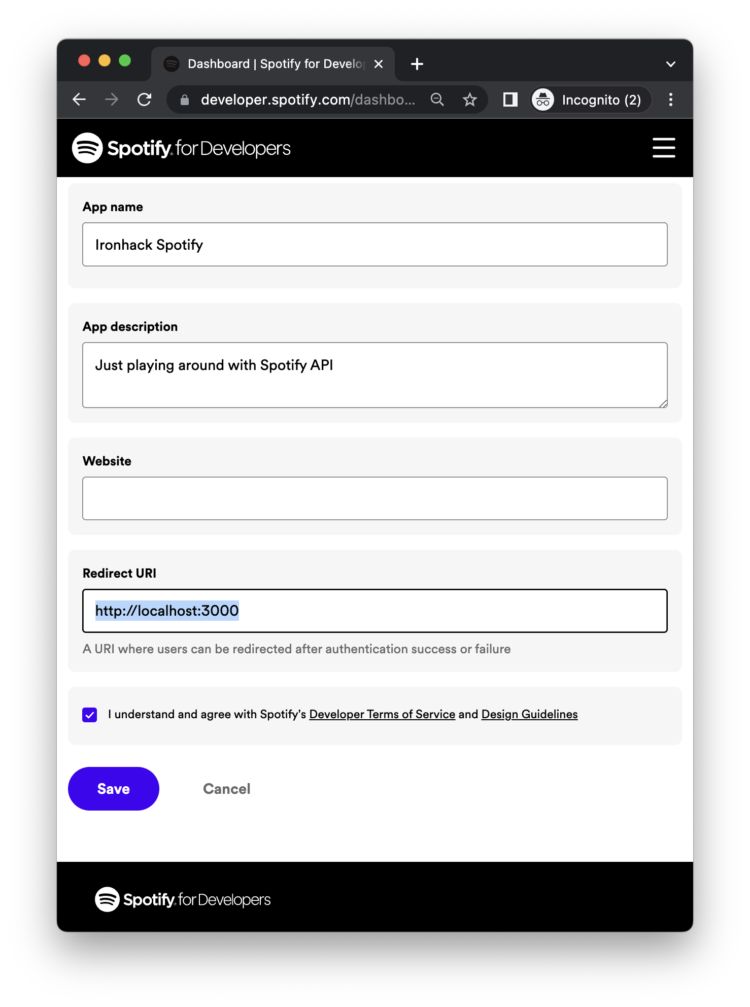 , we have to register our app on the official Spotify Developers website (you won't be charged for this, and no credit card information will be required). Let's follow these steps: