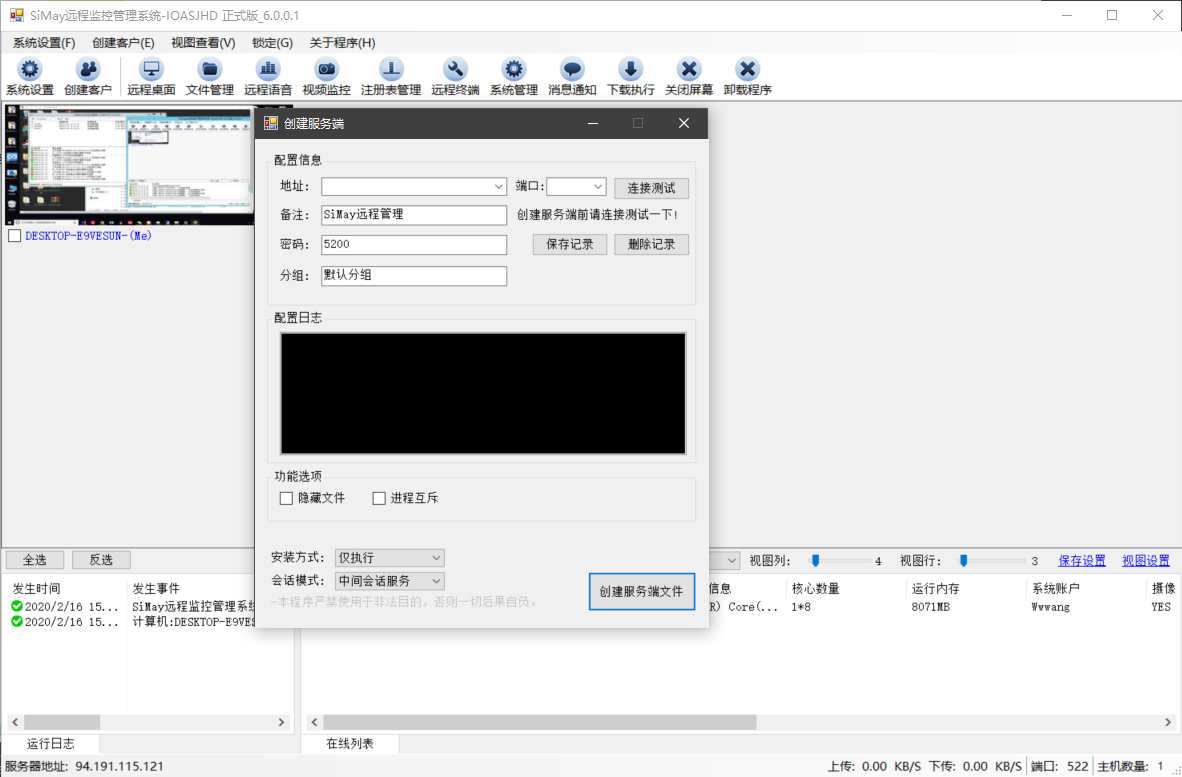 主控端:打开位与Bin目录下的主控端程序SiMayRemoteMonitor.exe,确认系统设置服务器地址为0.0.0.0(监听本机所有网卡),端口默认5200,使用会话模式为=本地服务器,然后保存配置重启程序, 重启后日志输出监听成功,即主控端设置正确。
