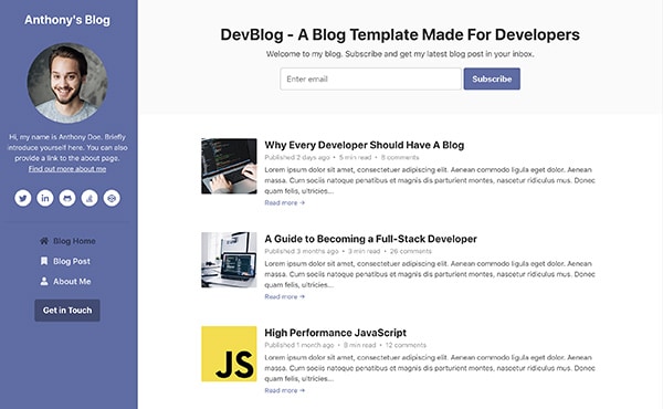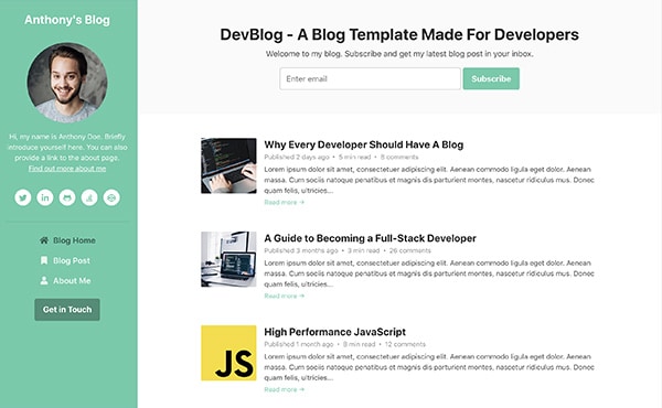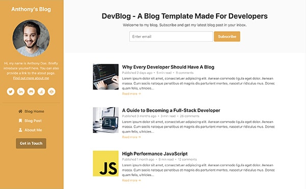 Blogging is a great way for developers to share their ideas and promote their work or side projects. This template can help you set up a professional-looking blog in no time. No need to rely on a third-party blogging platform – get all the traffic to your own site instead. Want to get your blog online and start building your audience? Don’t miss this template!