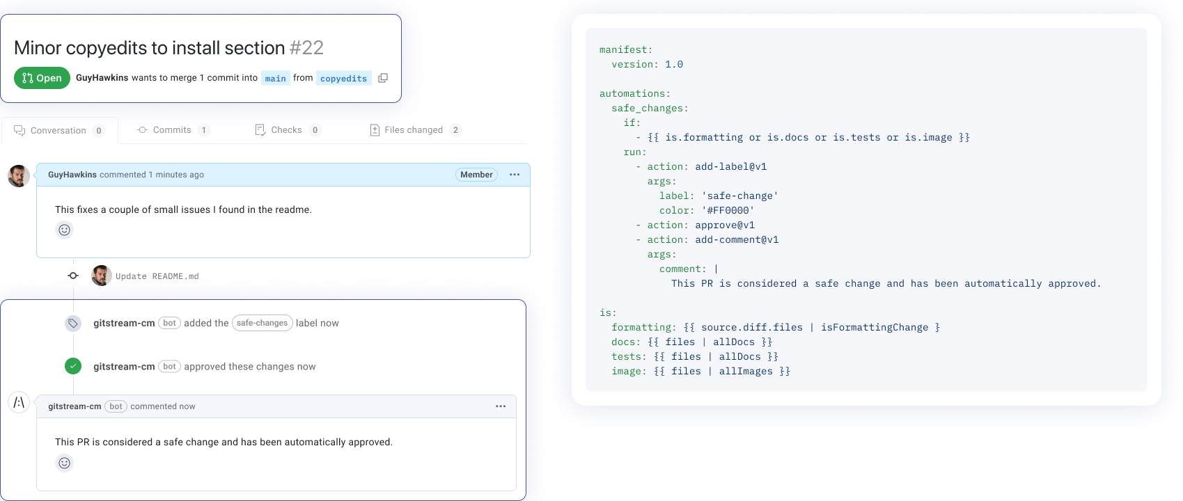 gitStream is a GitHub / GitLab / Bitbucket app that processes automations defined in Continuous Merge (CM) automation files contained in your git repos. You can test gitStream automations on your own PRs via the gitStream playground.
