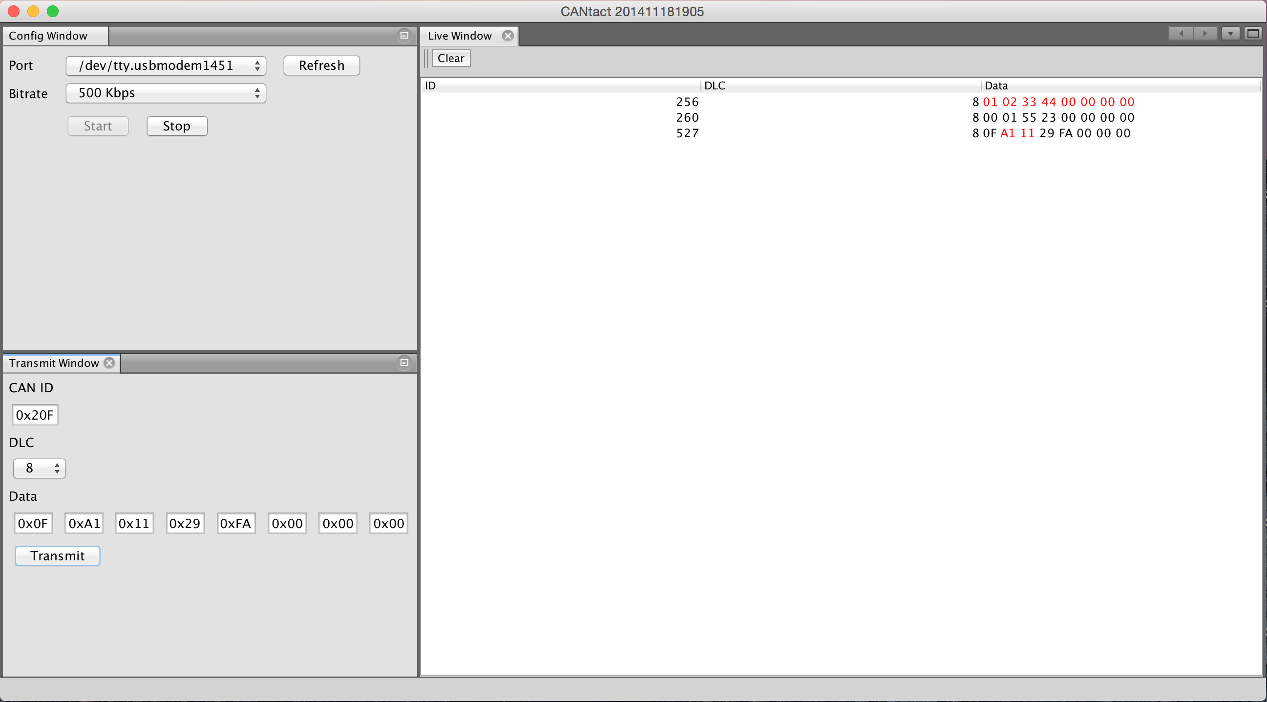 CANtact-app is an open source software tool for interfacing with Controller Area Network systems from the desktop. It is primarily intended to be used with the CANtact hardware, but should work with any device that uses the LAWICEL protocol.