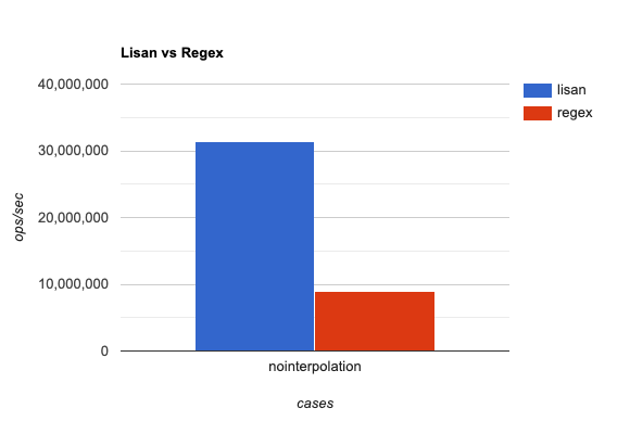 Lisan is super fast because it doesn't interpolate strings by finding and replacing placeholders in the translation templates. Instead, it relies on template literals which are pure string concatenation functions.