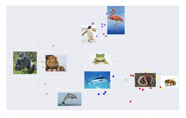 (Figure 3. Isomap is used with the Zoo-dataset. Images of animals are added to make the plot more interpretable.)Land animals such as gorillas and lions were placed to the left in the 2D-plane. Animals that live in or close to the water were placed in the center. For example, we see frogs at origo. Moving upwards from the origo, we start to see penguins and flamingos. Moving downwards, we start to see fishes such as tuna and dolphins. Furthermore, insects were placed to the right in the 2D-plane.