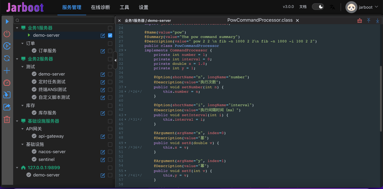 `---[0.053485ms] io.github.majianzheng.jarboot.demo.DemoServerApplication:add()
