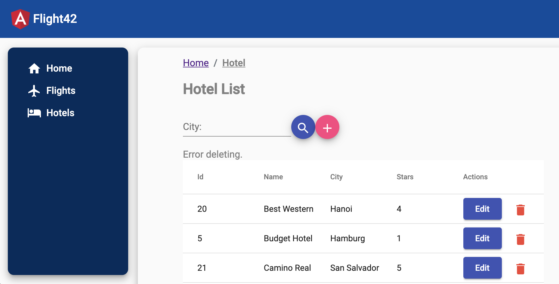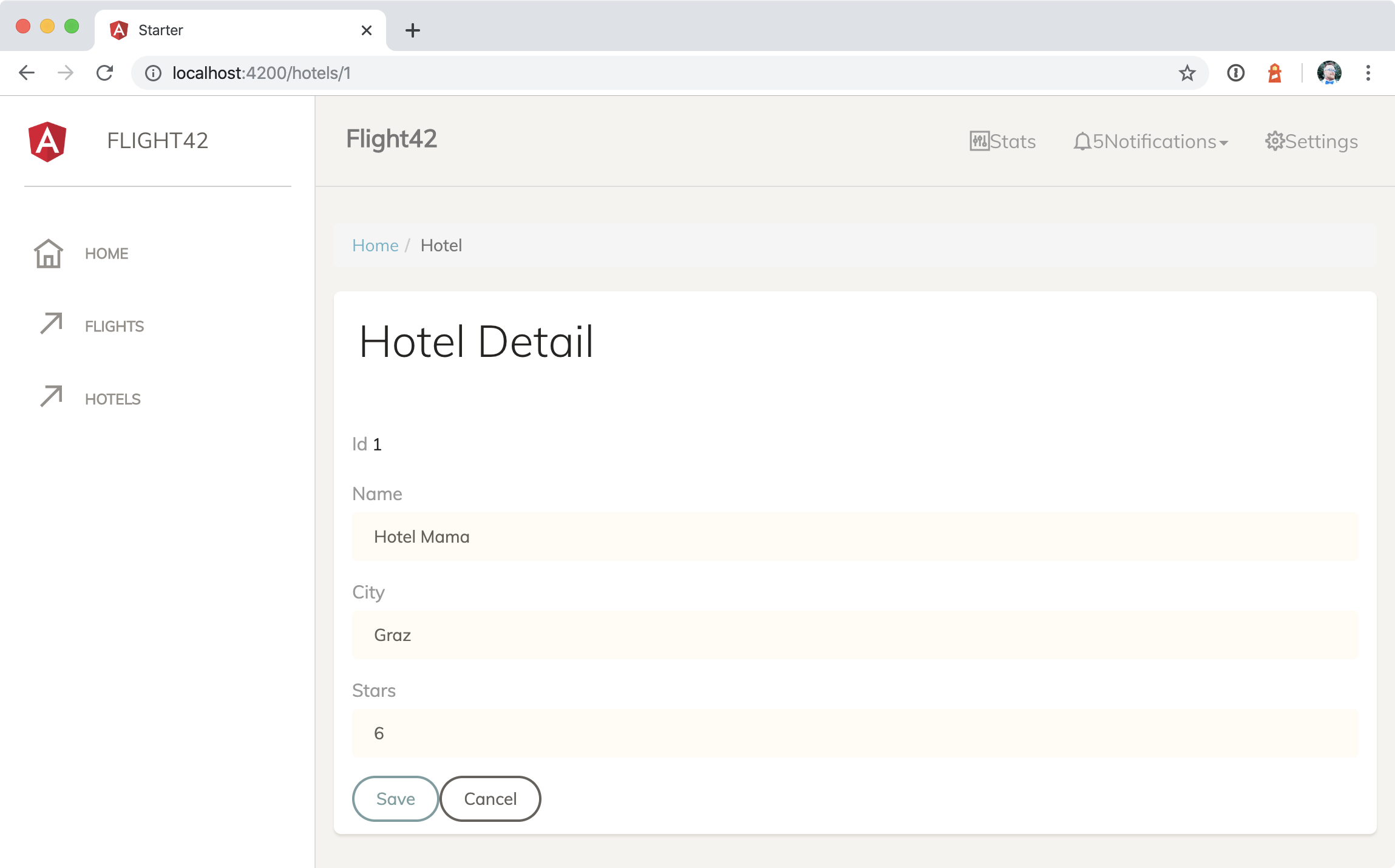 . Put the following content into this file:{ "title": "Hotel", "entity": "hotel", "api": { "url": "http://www.angular.at/api/hotel" }, "filter": [ "city" ], "fields": [ { "name": "id", "label": "Id", "isId": true, "readonly": true, "type": "number" }, { "name": "name", "type": "string", "label": "Name" }, { "name": "city", "type": "string", "label": "City" }, { "name": "stars", "type": "string", "control": "number", "label": "Stars" } ] }