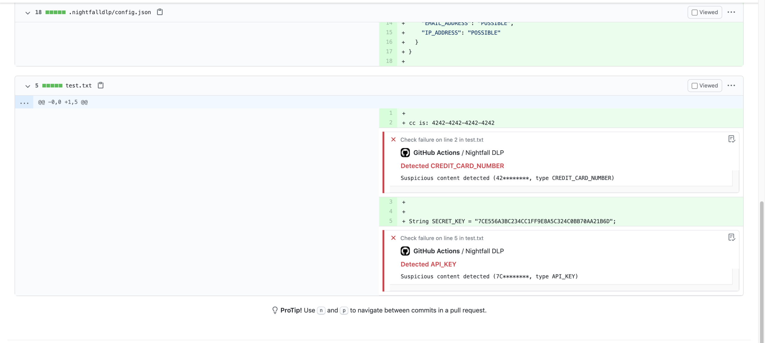 Here's an example of the Nightfall DLP GitHub Action providing feedback on a Pull Request: