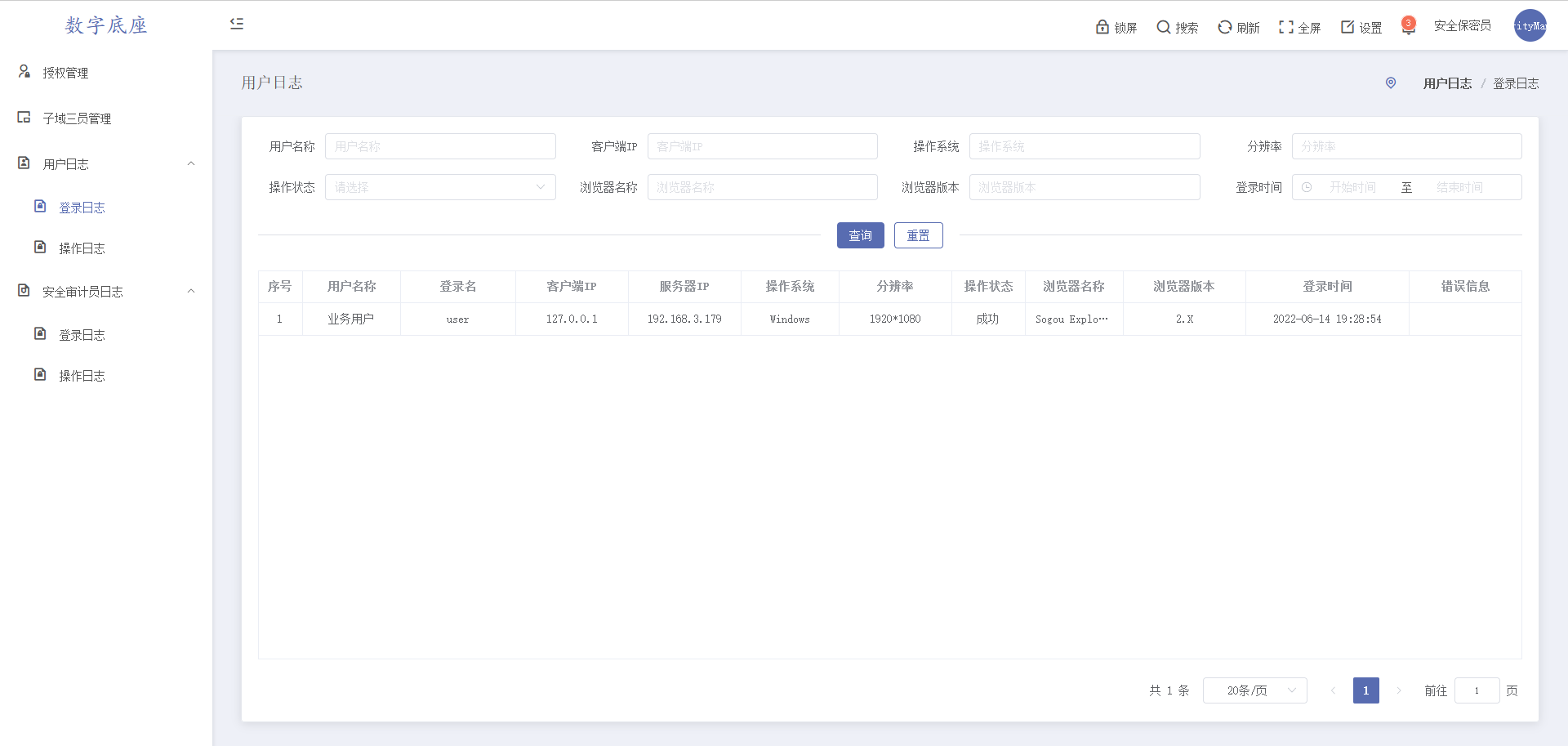 安全保密员日志 | 可以审查安全保密员的登录日志和操作日志。 |