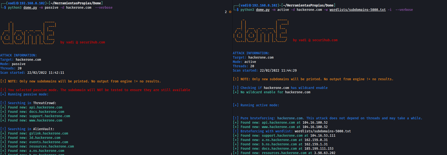 This mode will also make passive mode attack but in this case, the connection is tested to ensure the subdomain is still alive. To disable passive scan in active scan mode, use --no-passive